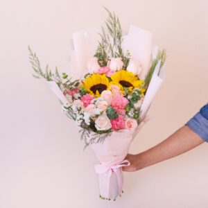 - Mix de girasoles y rosas rosadas (tono puede variar acorde a stock)