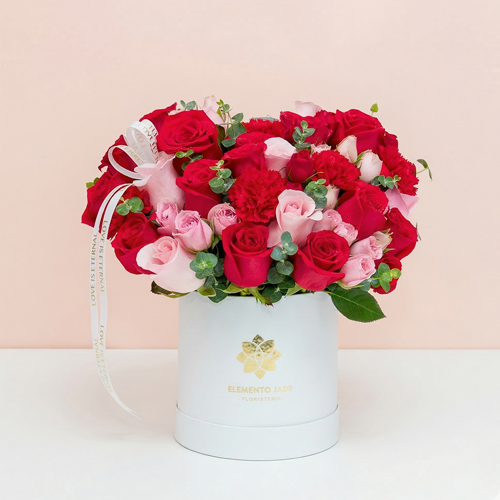 - Acompañado de mini rosas rosadas y claveles importados rojos